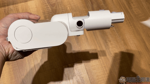 接著將裝好洗拖布的濕拖組合板安裝在軟絨滾筒刷下方,接著裝上金屬連接桿和睿米 Z1 掃拖抗菌無線吸塵器即可開始進行拖地工作:
