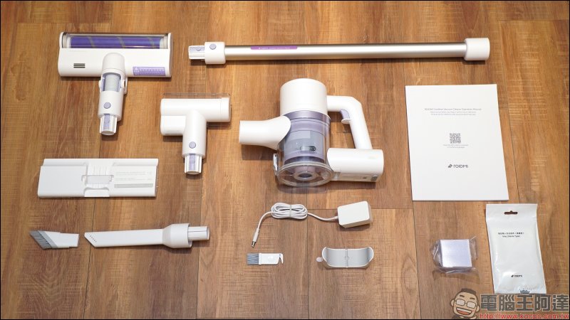除了睿米 Z1 掃拖抗菌無線吸塵器主機 ,將所有配件內容物整理如下。依序為金屬連接桿、軟絨滾筒刷、電動除蟎刷、專用扁平刷、專用短毛刷,共四種刷頭。另外,也附贈濕拖組合板、耐用水洗拖布、一次性抗菌拖布、薰衣草抗菌香皂、前置 HEPA 濾網、後置 HEPA 濾網、充電器、清潔刷、磁吸式收納架以及使用說明書。