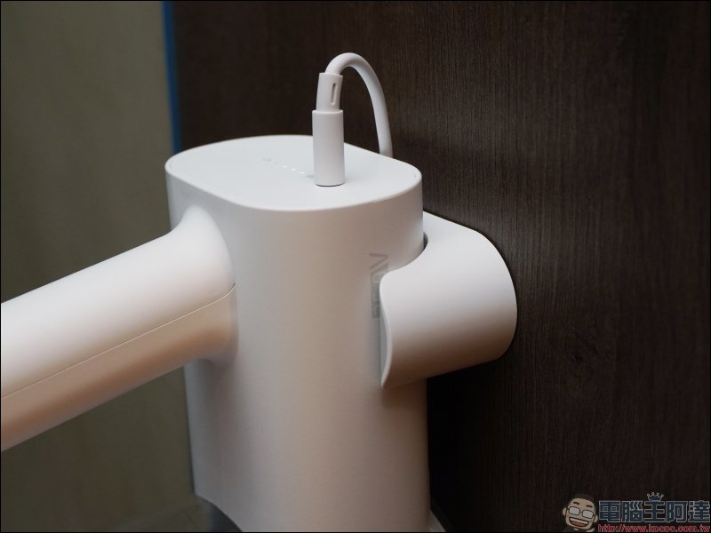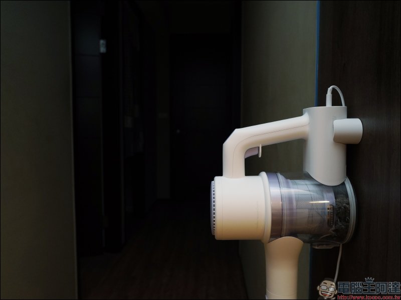 實際安裝的效果如下,電源線也能由磁吸式收納架內側的凹槽穿過,直接在收納期間同時為睿米 Z1 無線吸塵器進行充電: