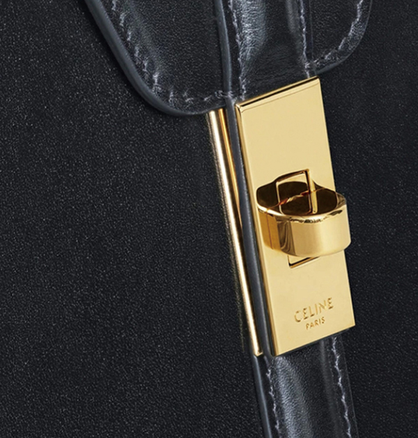 細節決定一切!「16」之所以吸引人,除了它落落大方的優雅造型,在幾個銜接處的黃銅運用,如:包蓋上的旋轉開扣、懸掛一旁的鎖頭、揹帶與提把兩端的扣環,甚至是底部的防撞釘等細節,「16」的成功不只是商業上的意義,更重要的是,它讓Celine在配件製作的金屬工藝重新 “歸隊” !