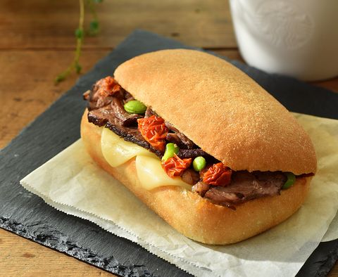 加入以比利時進口酸麵包粉製作的巧巴達麵包,夾上營養價值高的綠色毛豆仁、淡淡奶香摩佐起司、橄欖油漬番茄乾鹹酸甜、使用多種蔬果及辛香料的燉牛肉片,豐富多料三明治,飽足一餐!《葷食》