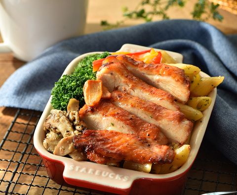 以花椰菜、洋蔥、彩椒等蔬菜拌炒和蒜香系調味料,讓義大利麵香氣濃郁,搭配上多汁香氣十足的洋菇一起入菜,口感清爽,蒜片和鮮菇的香氣也充分融合,最後鋪上番茄系醬汁醃製雞腿肉,炙烤後激發出雞肉香甜味。《葷食》