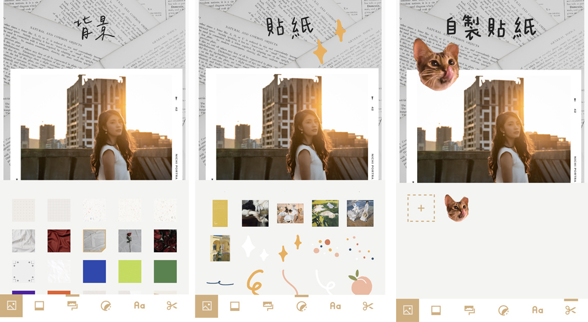 照片框、背景、貼紙等等都可以任意組合。甚至可以自己製作去背小貼紙,獨創性很高。