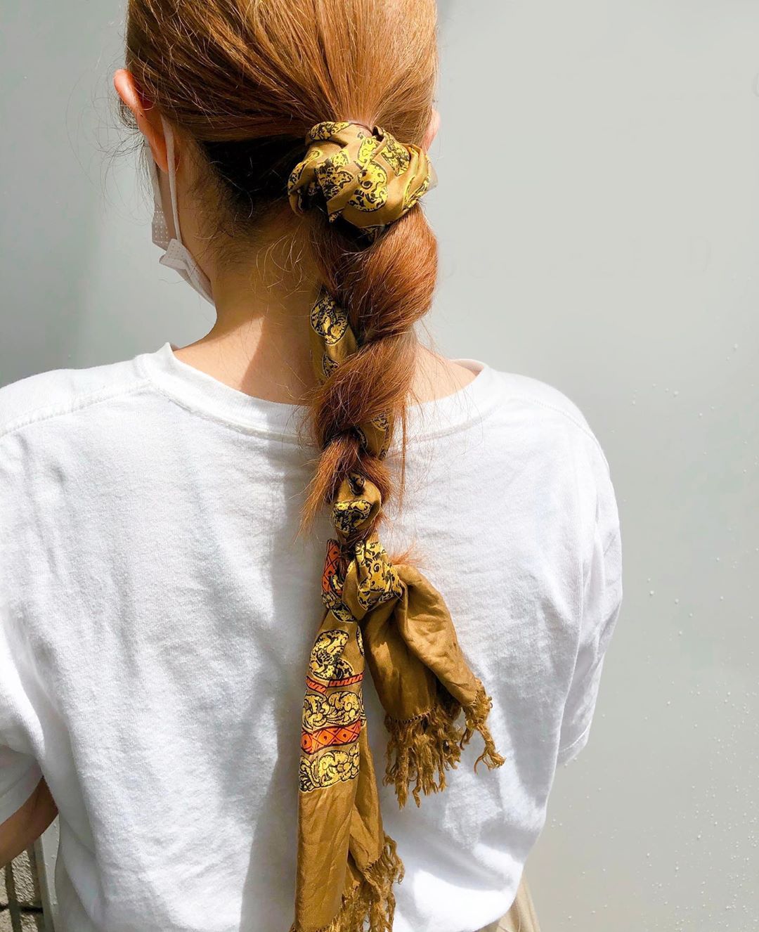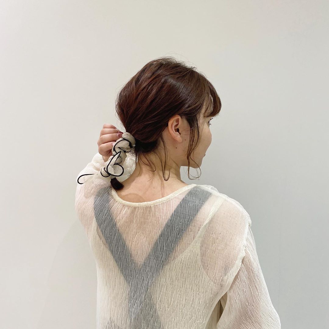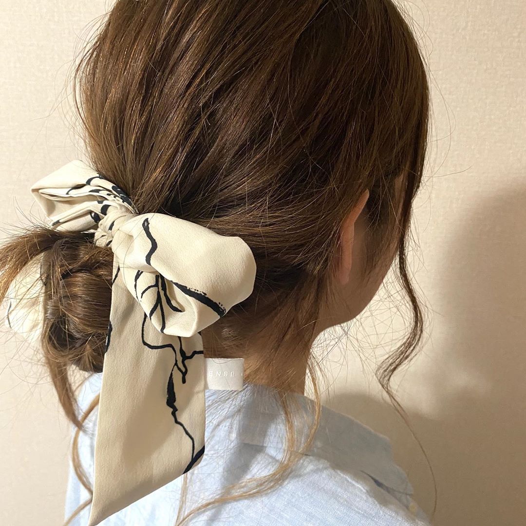 前陣子韓國很流行復古風的大腸髮圈,絲質澎澎的造型隨便綁個馬尾都仙氣十足!不過日妞也有自己的小訣竅,即是將各種花樣的絲巾直接作為髮圈使用,不論是繫出馬尾、馬尾辮還是包子頭,只要先(1)用橡皮圈綁出想要造型後,再(2)將絲巾纏繞於髮圈固定處,綁蝴蝶結或是自然垂墜都很有氣質!