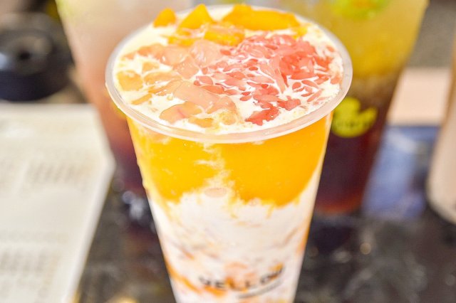 芒果冰沙和芒果果肉香甜可口,還能咬到愛玉、粉角QQ的口感,酸甜的葡萄柚果粒,再加上香濃的鮮奶,讓所有的配料完美融合,喝起來更順口香甜,超好喝的,喝過絕對忘不了!