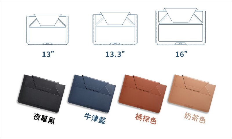 因應不同的筆電尺寸, MOFT 隱形立架筆電包共推出 13 吋、 13.3 吋以及 16 吋三種款式。顏色方面則提供夜幕黑(本次測試款式)、牛津藍、橘棕色以及奶茶色共四款選擇。