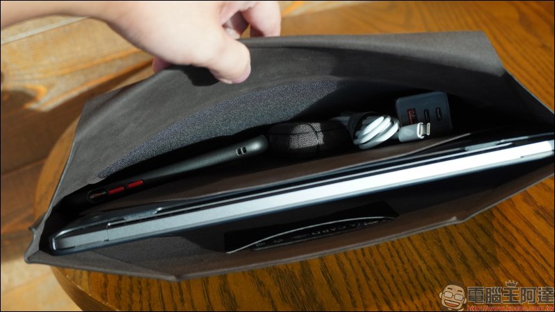 可以看到筆電包內部採用分層的結構設計,分別為筆電層以及旁邊配件收納層,這收納配件的開口處採採用磁吸封口,不僅配件不會不小心從筆電包掉出,也能維持原有的輕薄厚度。