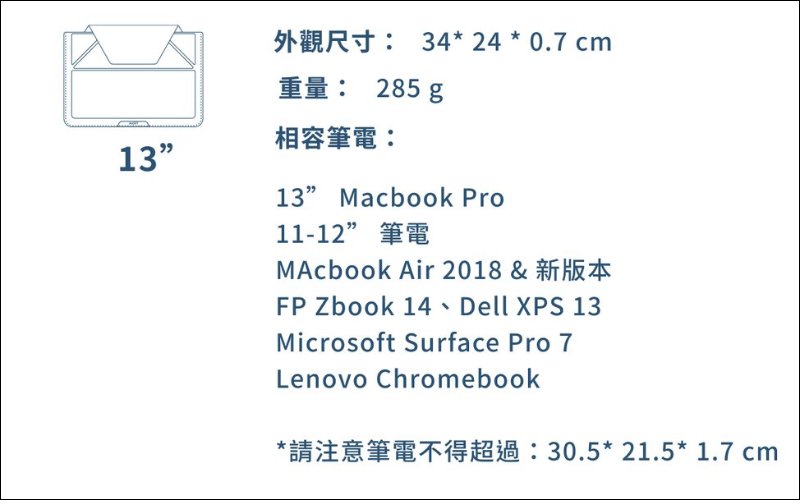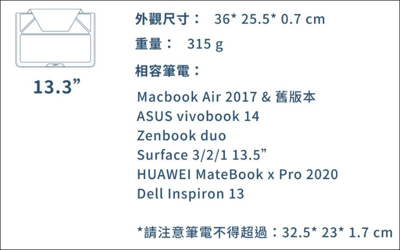 如果 13 吋版本裝不下自己的筆電,則可選擇較大的 13.3 吋版本。各位同樣能參考下圖相容筆電整理與尺寸提醒,幫助各位選擇適合的尺寸。