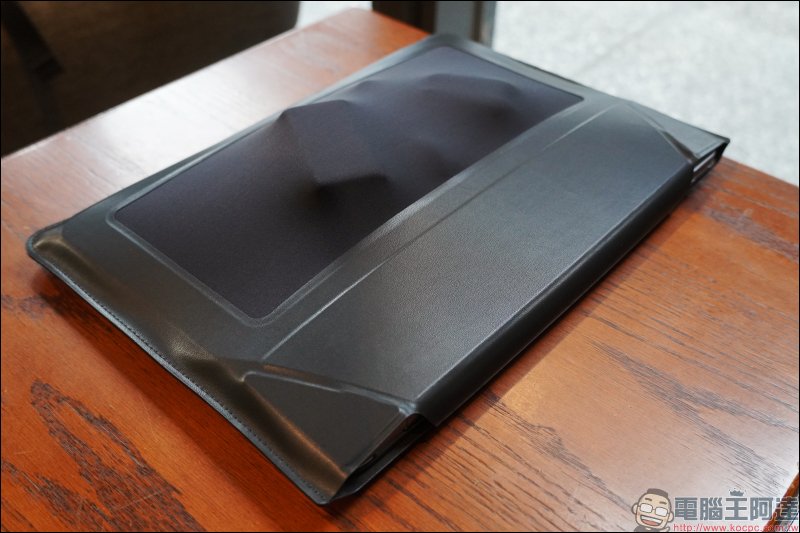 取出 MOFT 隱形立架筆電包,就是這樣薄薄一片,表面上有些幾何的折線這麼簡單且輕薄的外型。