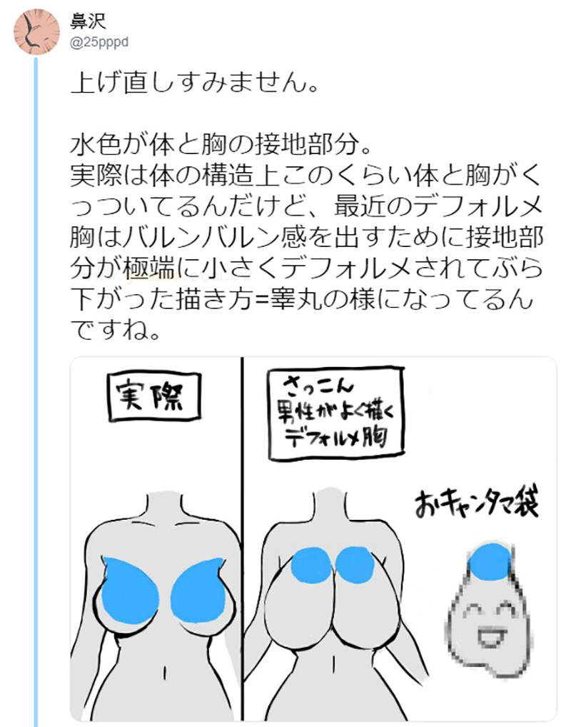 就有日本女網友在twitter上批評宇崎學妹的巨乳畫法根本不正常,長得還有點像是男人的「蛋蛋袋」