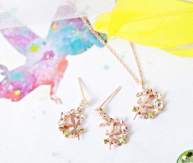 Dream系列除了有星辰相伴的小仙子主題飾品,最受矚目的就是這組「星空寶石項鍊&耳環」,採用《小飛俠彼得潘》主角群的造型藍、綠配色,又像是他們飛翔的星空夜色,全都收進寶石之中,周圍還用金色線條、小顆水鑽勾勒,戴上馬上變身神秘公主。