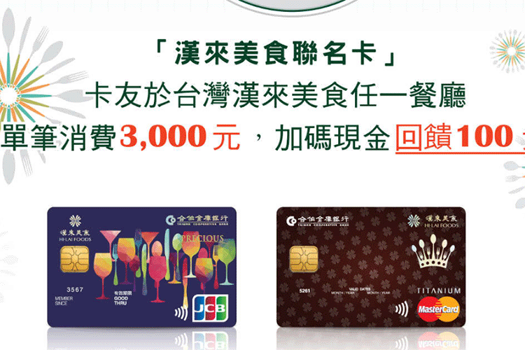 活動期間內,持合作金庫漢來美食聯名卡至台灣漢來美食任一餐廳單筆消費滿3,000元,加碼現金回饋100元。
