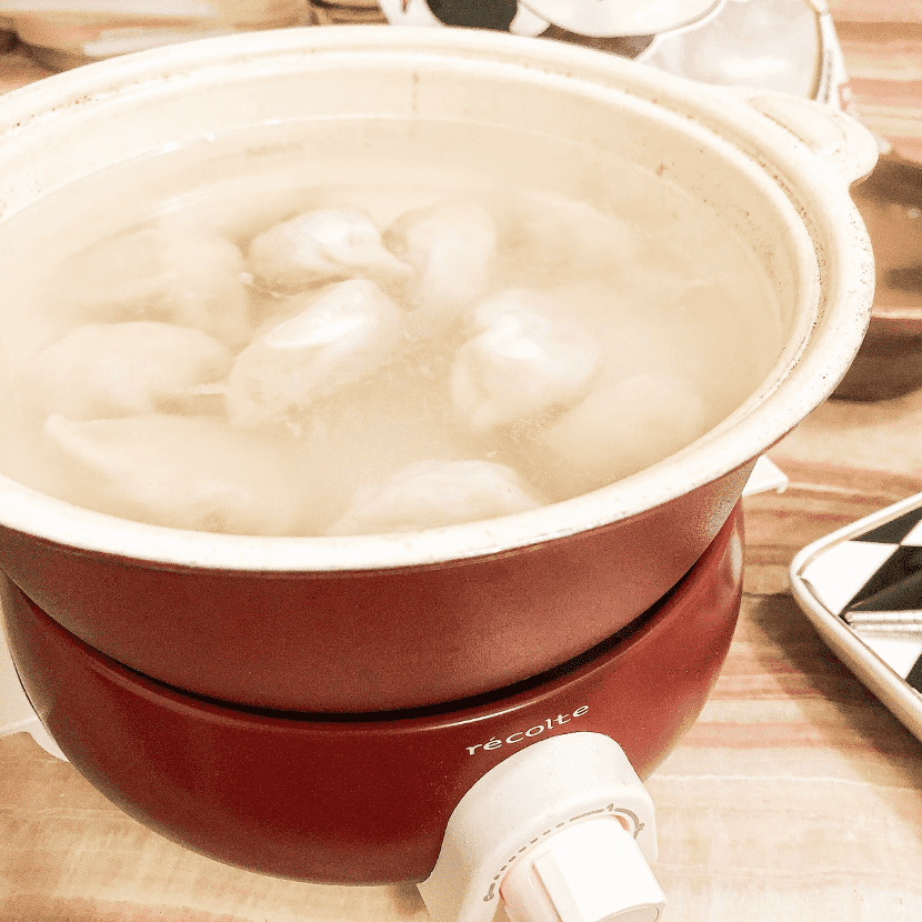 這邊分享一個小撇步,水滾了之後用工具讓鍋裡的水產生旋轉,將水餃丟下去的時候不容易皮跟皮黏在一起。