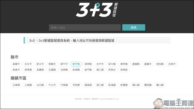 首先,開啟「找找3+3郵遞區號」線上查詢工具點選縣市: