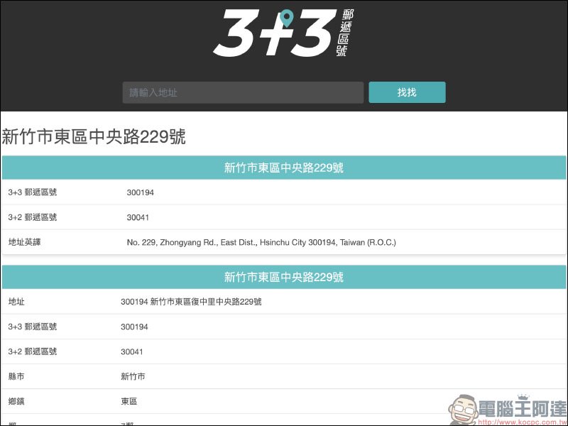 倘若有確切的地址資訊,也能接載文字輸入欄位輸入地址並按下「找找」進行查詢。若以完整的地址進行查詢,除了可以顯示 3+3 郵遞區號、3+2郵遞區號,甚至是翻譯的英文地址都能一次檢視,對於需要在國外購物網站訂購商品的消費者來說,這項功能就相當方便!