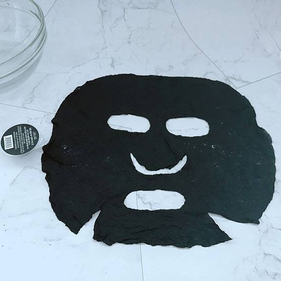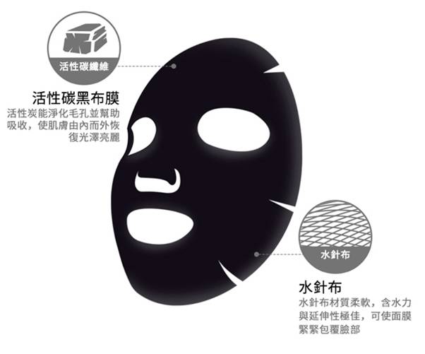 以活性碳與水針布製成的面膜材質~柔軟細緻~緊緊包覆臉部線條,敷臉同時淨化毛孔並幫助加強吸收~