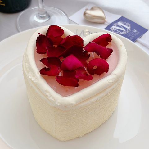 主廚特別選在七夕以紅玫瑰花瓣點綴, 表現古典浪漫印象,搭配上層淡粉鏡面,增添浪漫優雅氣息,內餡則融合玫瑰與 卡士達鮮奶油,感受花香在口中綻放!