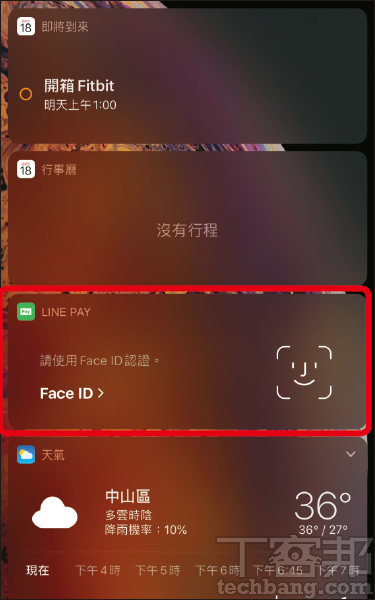 步驟4.完成後,日後即可在手機鎖定狀態下滑動至 Widget 小工具,並使用 Face ID 來快速認證「LINE Pay」。