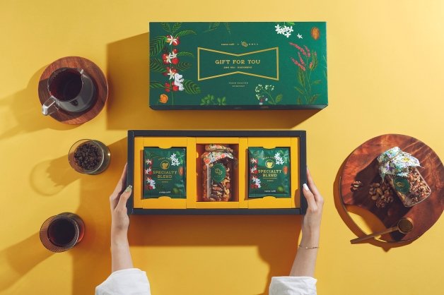 cama café今年攜手團圓堅果聯名推出「中秋團圓禮盒」,以綠色和黃色的大地色為主色調,搭配手繪植物插圖,象徵自然的生生不息,內含有以日曬和水洗的中度烘培「林間寶石」濾掛咖啡和堅果罐,堅果罐包含核桃、杏仁和腰果,堅持無調味製程,保有果仁的香氣和甜味,咖啡配堅果堆疊出豐富的口感!