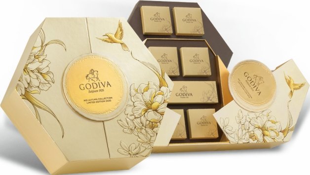 GODIVA中秋月餅禮盒推出「全新巧克力月餅」並加上極具中國風的包裝設計,六種口味分別為桂花豆沙牛奶巧克力月餅、抹茶金桔白巧克力月餅、覆盆子玫瑰風味白巧克力月餅、百香果榛子牛奶巧克力月餅、椰蓉夏威夷果仁黑巧克力月餅和生薑芒果黑巧克力月餅,以塔殼包裹巧克力夾心,中間為各種不同風味的軟夾心,搭配香脆可口的堅果粒等,從15片裝的NT$950到中秋節奢享禮籃 NT$7,160各種價位都有!