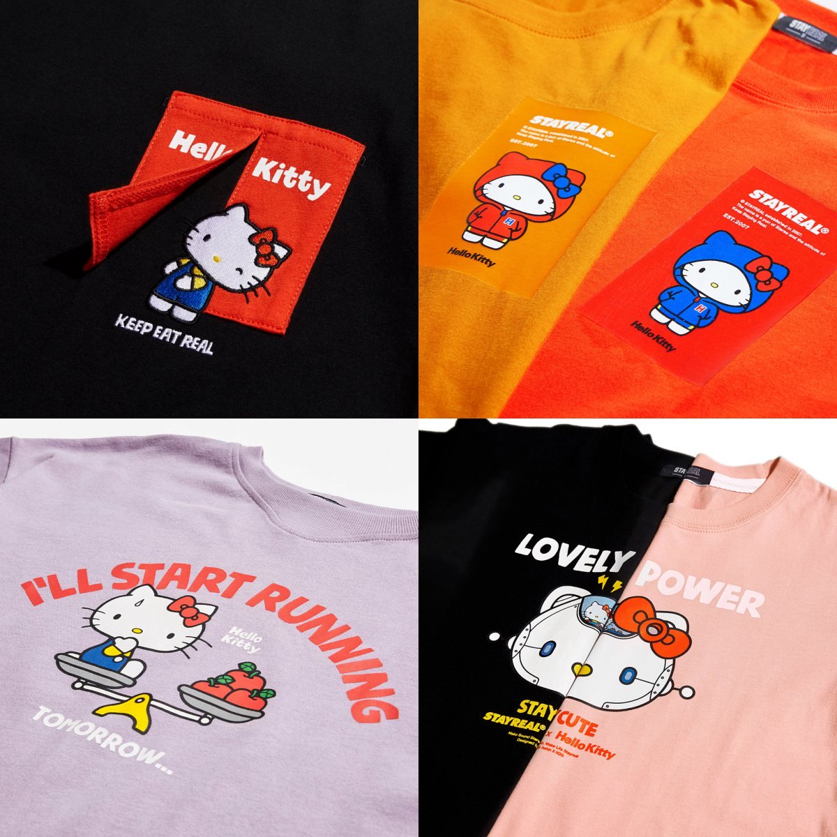 上一波海綿寶寶的熱度還沒消退,STAYREAL在8月又再度找來重量級大咖,品牌第一個聯名的角色Hello Kitty可愛回歸,這次以Hello Kitty最喜歡的「蘋果」作為設計靈感,展現Kitty的生活日常,除了首次看到體重超標的Kitty之外,還有在第一次聯名中就登場過的「機械凱蒂」,不管在服裝色系或圖案都非常豐富繽紛,要一舉攻佔Kitty迷的心!