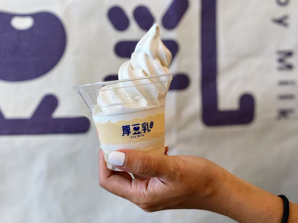 「厚豆乳霜淇淋」搭配限量的黑色餅皮,造型簡約時尚,霜淇淋將大豆磨成粉以保留最原始的豆香,享用時可品嚐到融合在奶香中的豆乳香味,甜而不膩的口感消暑又解膩。