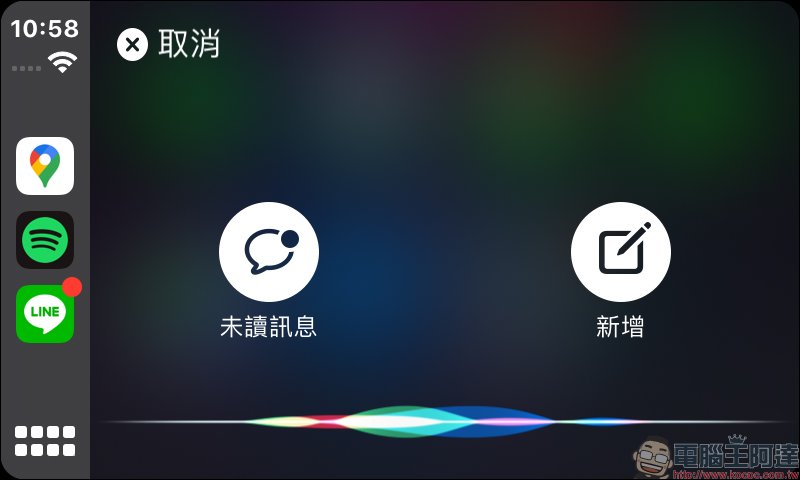 若想查看未讀訊息,由於目前 CarPlay 系統限制,用戶只能用 Siri 語音助理說出指令選擇要聆聽未讀訊息,或以語音輸入方式新增訊息。