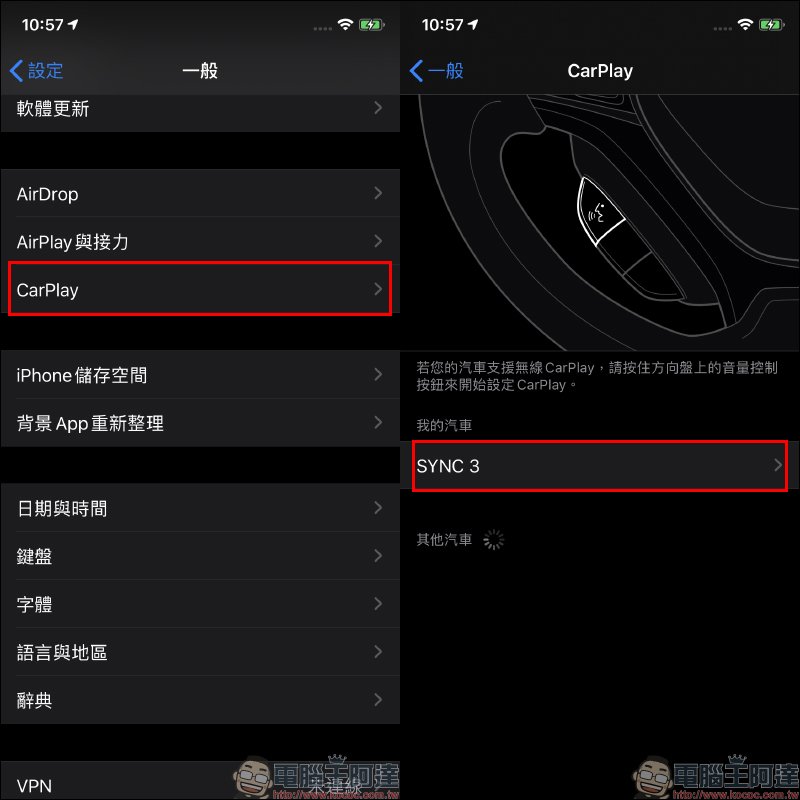 若想調整 CarPlay 系統的應用程式顯示順序,首先在 iPhone 設定選擇「一般」,接著依序選擇「CarPlay」後再點選我的汽車列表中的裝置: