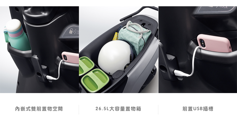 差異化的部分,在 PBGN 換電聯盟後追的台鈴 eReady,宣稱在散熱效率的部分比同聯盟車款提升了 23%,至於簧下重量乃至於對女性更友善的中柱省力效果方面,則是分別更減輕了 15% 與 11%。還提供了雙前置物空間 -- USB 充電插孔則是巧妙地隱藏在掛鉤側邊位置。