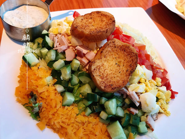 利用食材的原色,組成彩虹冷盤,特選番茄、水煮蛋、蔬菜小黃瓜、雙起司,吸睛的彩虹沙拉再淋上酸酸甜甜的紅酒油醋醬,無論你是否吃素,都會愛上這道料理。