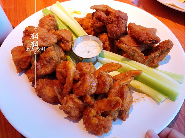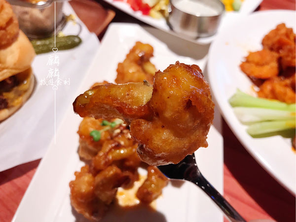 道地美式炸物拼盤,集合雞翅、無骨雞塊、蝦子,特色厚麵衣在拌上特製甜辣醬,麵衣吸滿了微甜辣醬,先甜後辣,搭配一杯冰涼飲品,超舒爽!