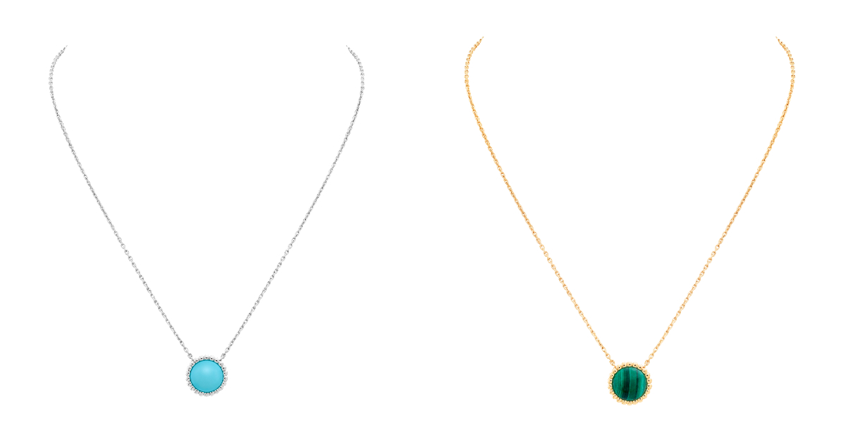 由左至右,Perlée couleurs吊墜(白K金及綠松石)、Perlée couleurs吊墜(黃K金及孔雀石)