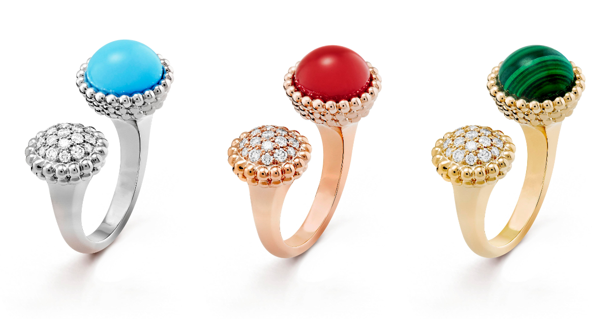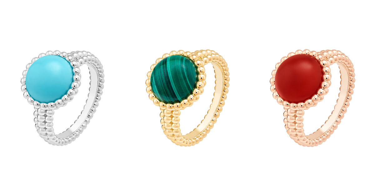 由左至右,Perlée couleurs戒指(白K金及綠松石)、Perlée couleurs戒指(黃K金及孔雀石)、Perlée couleurs戒指(玫瑰金及紅玉髓)