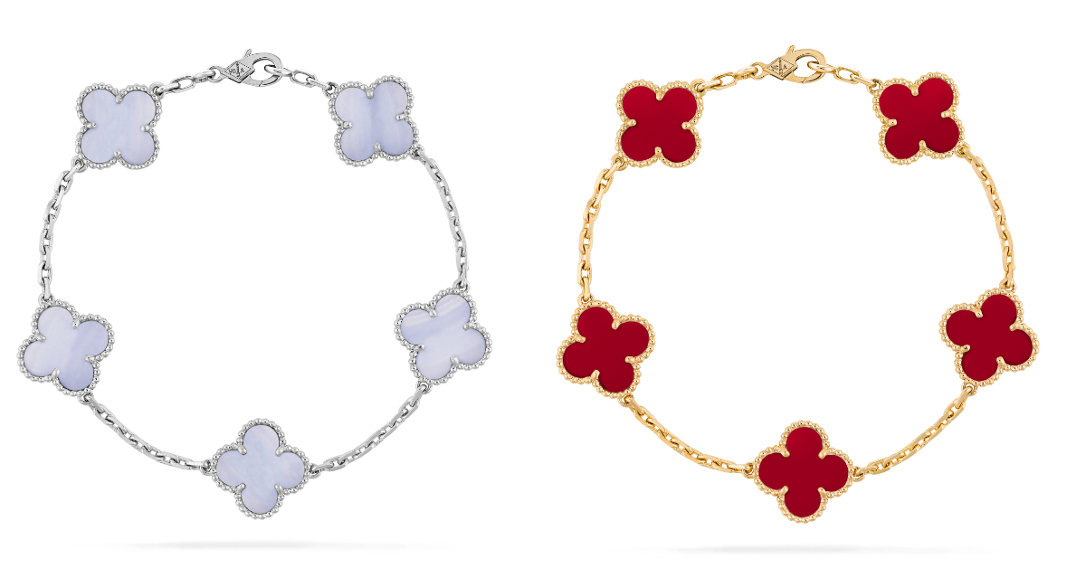 由左至右,Vintage Alhambra手鍊(白K金,玉髓)、Vintage Alhambra手鍊(黃K金,紅玉髓)