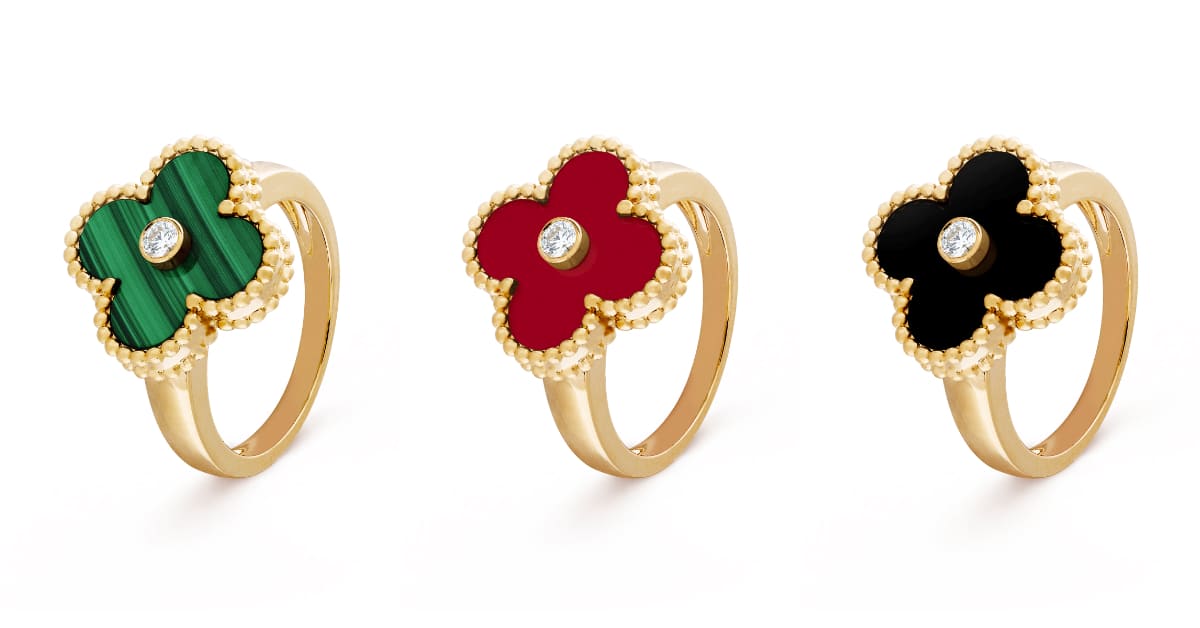 由左至右,Vintage Alhambra戒指(黃K金,鑽石,孔雀石)、Vintage Alhambra 戒指(黃K金,鑽石,紅玉髓)、Vintage Alhambra戒指(黃K金,鑽石,縞瑪瑙)
