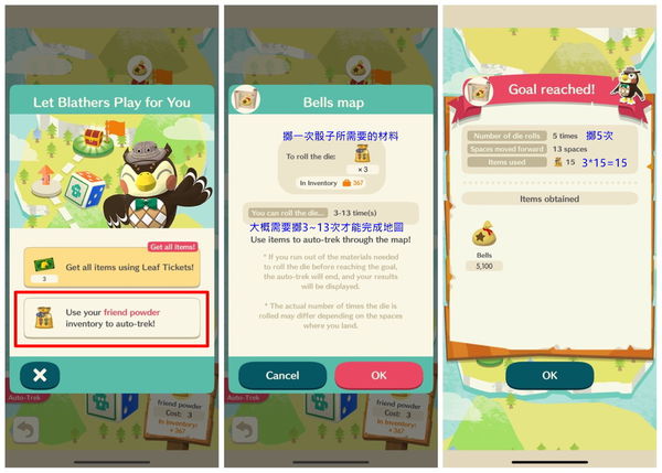 點選貓頭鷹會出現很多種地圖,點選你想要的獎品地圖,下方會出現骰一次需要多少個相對素材,點選Auto-Trek即可自動擲骰到終點,節省遊戲時間。例如這張5000鈴錢的地圖,骰一次需要3個朋友粉,點進去後左下有一個Auto-Trek的按鈕,按下去後會出現要用綠葉卷還是朋友粉進行擲骰,但因為綠葉卷是非常珍貴的,就選下面的朋友粉,會出現完成地圖大概需要幾次擲骰子的次數,大家可先試算一下,避免素材不夠,這張地圖完成需要5次,3*5=15(這次花的素材數量)