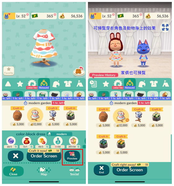 4. 2020.05第一次更新的時候,新增了衣服以及傢俱預覽功能,衣服除了穿戴在自己身上外,也可預覽穿戴在小動物身上的樣子,如果想看特定動物穿戴的效果,也可自由切換。