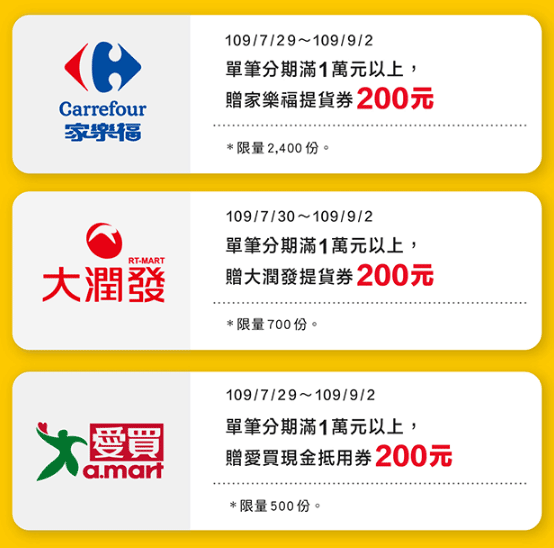 活動期間內,持中國信託信用卡至以下三大賣場消費,單筆分期滿額贈購物券。