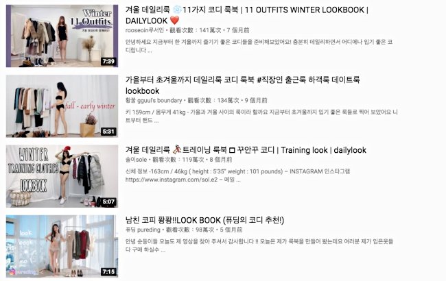 「속옷 록북(內衣LOOKBOOK)」省去每個單品的介紹內容只用打字標示、多倍數快轉穿脫過程,一套造型大約只要花費10秒,5分鐘左右,轉眼間就能看完一週OOTD示範,相較於以前的穿搭示範影片少說15分鐘起跳,讓觀看者更能快速掌握想要的資訊。