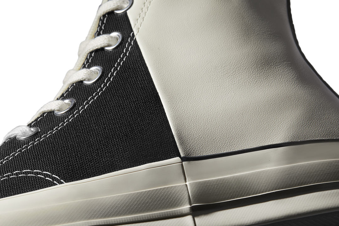 Converse 認為,每個人都有彰顯自我的獨特方式,Converse Rivals 系列將發揮創造力,為兩鞋款帶來了全新的魅力。Chuck 70 均為高筒,擁有混合材質的鞋面。其中一款以白色和米白色帆布混搭配以紅色標章,兩種白色在標章部分進行不規則錯位拼接,它的後跟標也採用了較錯落的設計;而另外一款則是由黑、白色皮革進行混搭重組。它們均以大膽創新的顏色搭配和面料材質完成了創意碰撞。