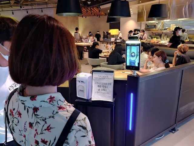 完成入場後,再依工作人員指定,在人臉辨識體溫感側儀上確認體溫正常後