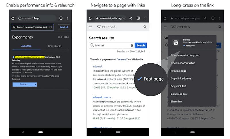 Google 表示,在標記時,具有相似結構的站點 URL 歷史數據會匯總在一起,當收集的相關 URL 數據不足以評估速度或尚不可用時(例如,URL 為新 URL 或不受歡迎的網站時),將逐主機評估此歷史數據。截至目前,「Fast Page」標籤已在 Chrome 85 beta 中推出,但是你也可以透過從「 chrome:// flags」中啟用「Context menu performance info and remote hint fetching」來手動將其打開。此功能推出後,用戶在精簡模式下或打開“「使搜索和瀏覽效果更好 」選項後,將看到此標籤。