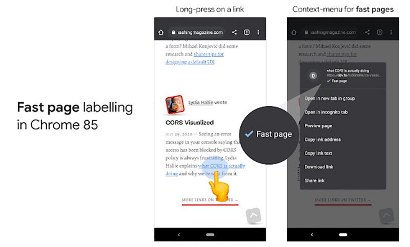 Android 版 Chrome 85 導入「Fast Page」標籤,醒目標示符合 Core Web Vitals 指標的網站