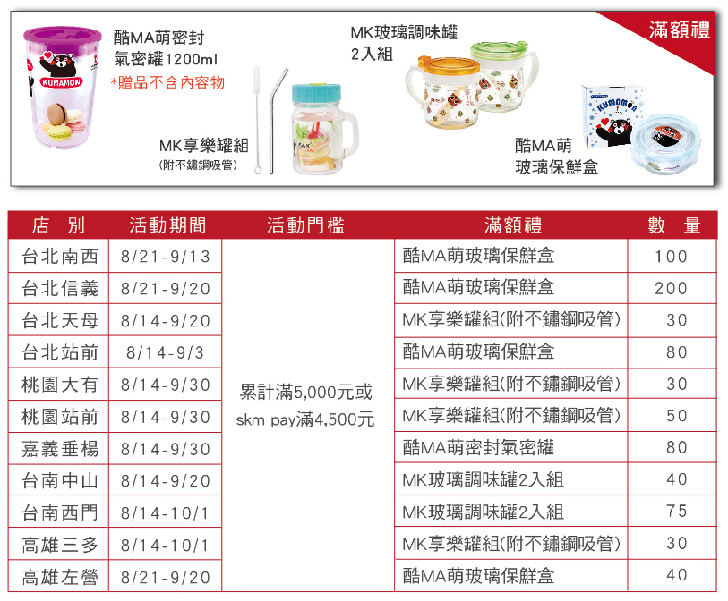 活動期間內,持新光銀行信用卡於全台新光三越百貨,當日當店單卡刷卡累積消費達指定門檻,即可兌換滿額禮一份。