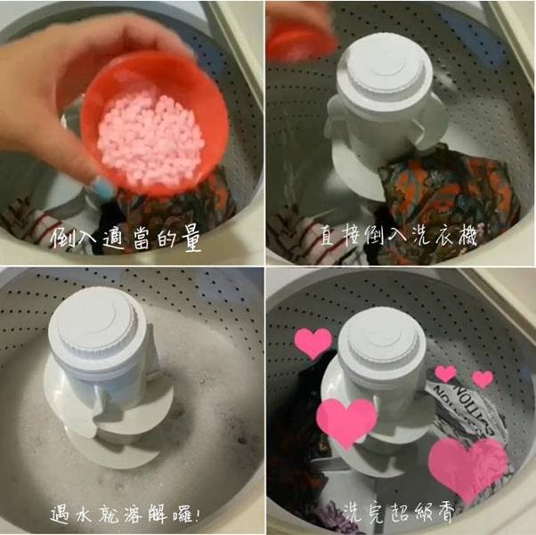 洗衣時可直接放入洗衣機內(遇水會溶解)量不用多~ 就可以很香!