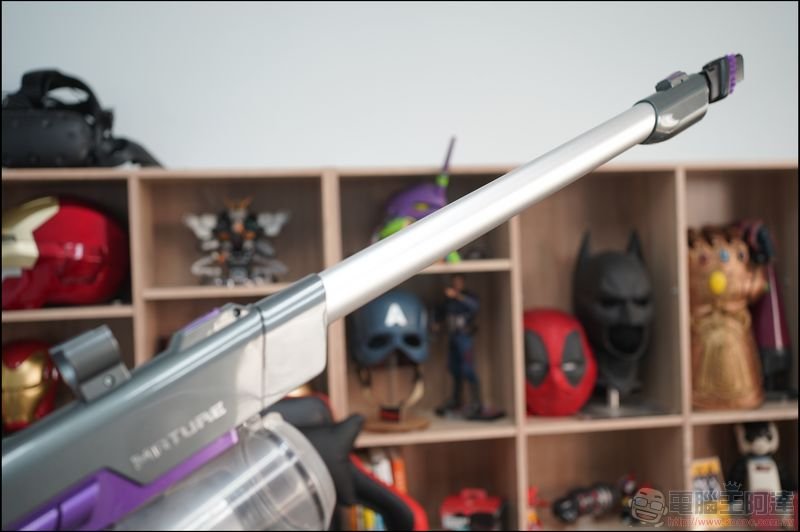 先來看一下吸塵器本體,造型很「科幻」感覺很像雷射槍還是噴火器(誤),紫灰相間蠻好看的: