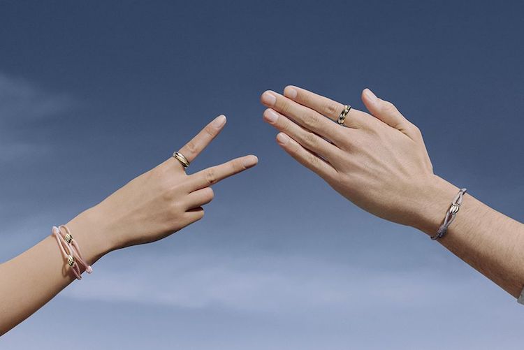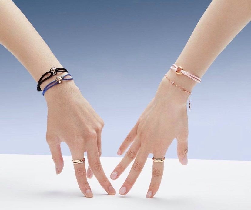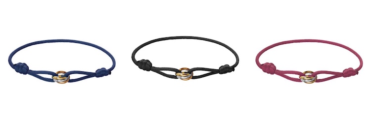 Cartier Trinity 三環戒指系列,最早誕生於 1924 年,品牌以白金、黃金及玫瑰金,分別象徵友情、親情及愛情,結合後則象徵至死不渝的愛,品牌這次言入這個精神,並搭配 25 種配色的絲繩,讓經典的三環戒以手環的形式呈現。