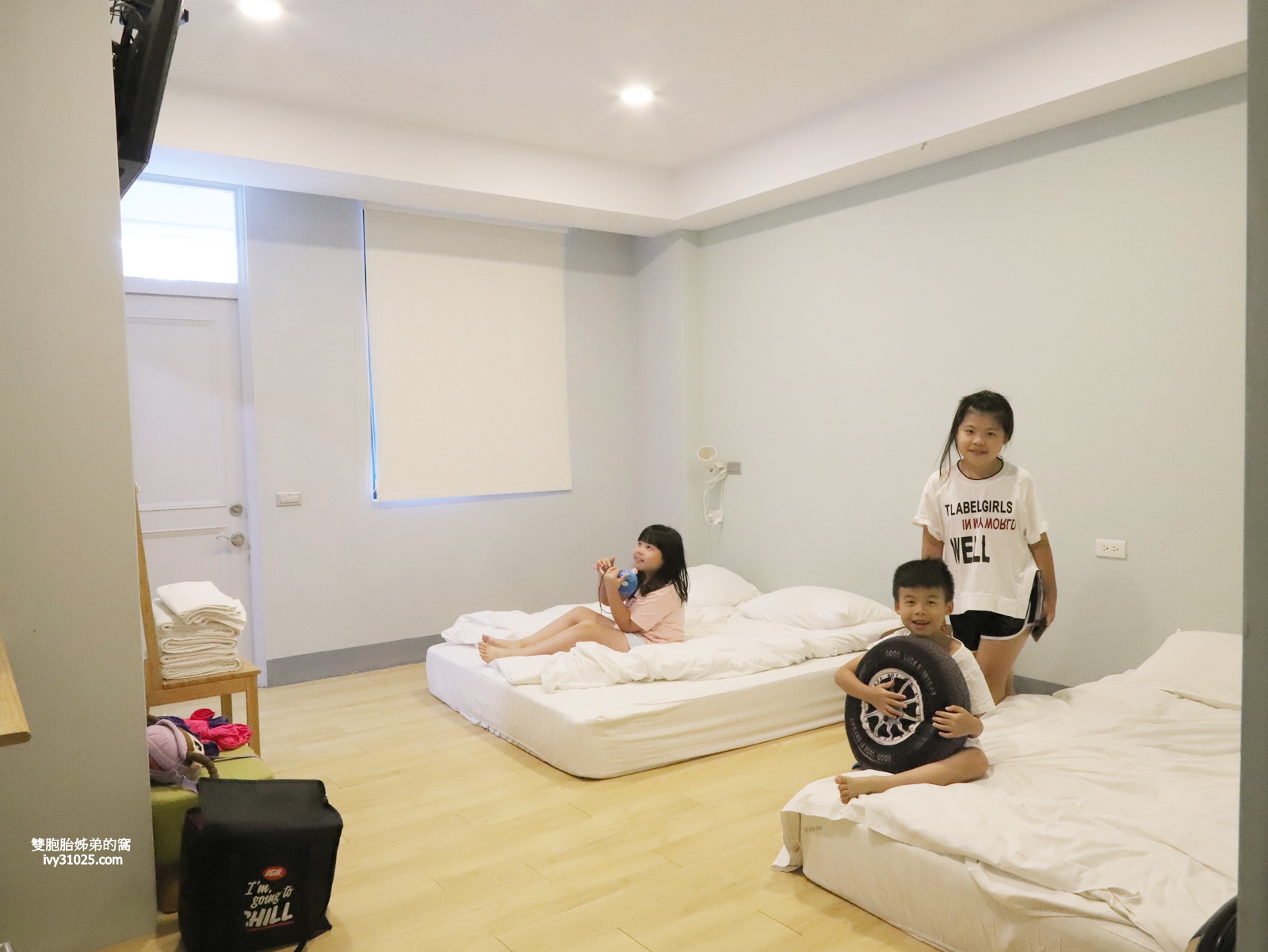 這間親子四人房適合全家出遊的日式風格房型,偏像日式和室房,是床墊放在木板上,讓小朋友在跑跳不會撞上床櫃邊邊角角,很多小朋友超喜歡這樣的房型。