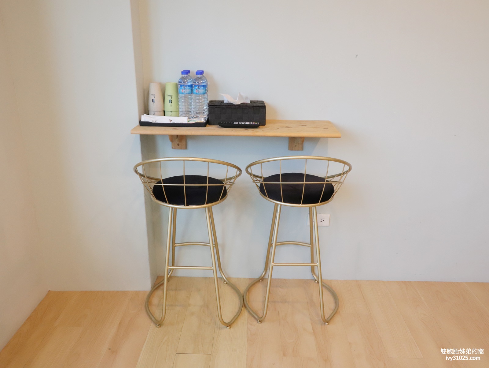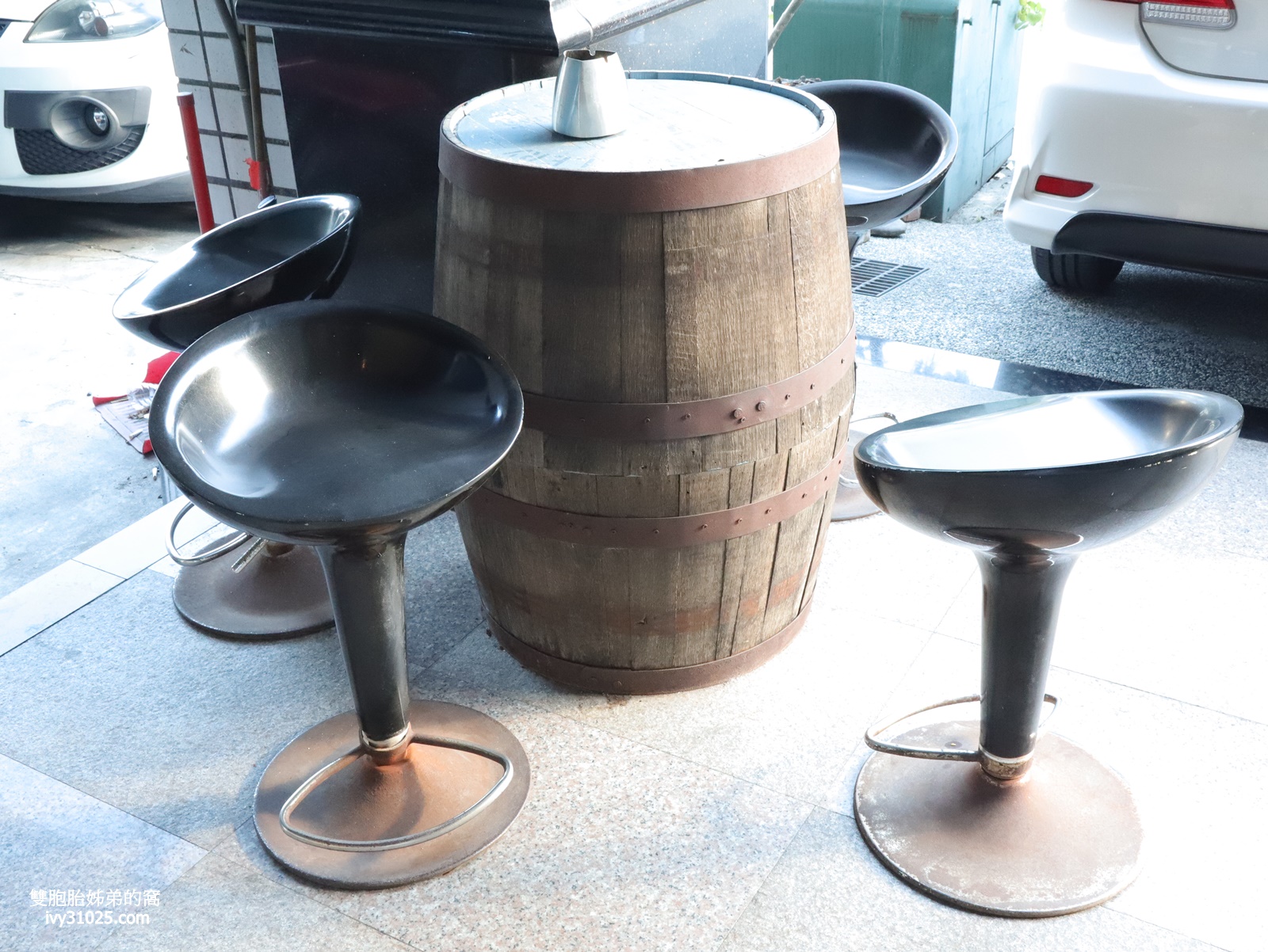 M.house旅宿門口有木桶式桌子和高腳椅,因為民宿內禁菸,所以想抽菸的朋友可以到門口抽菸,真的很貼心。