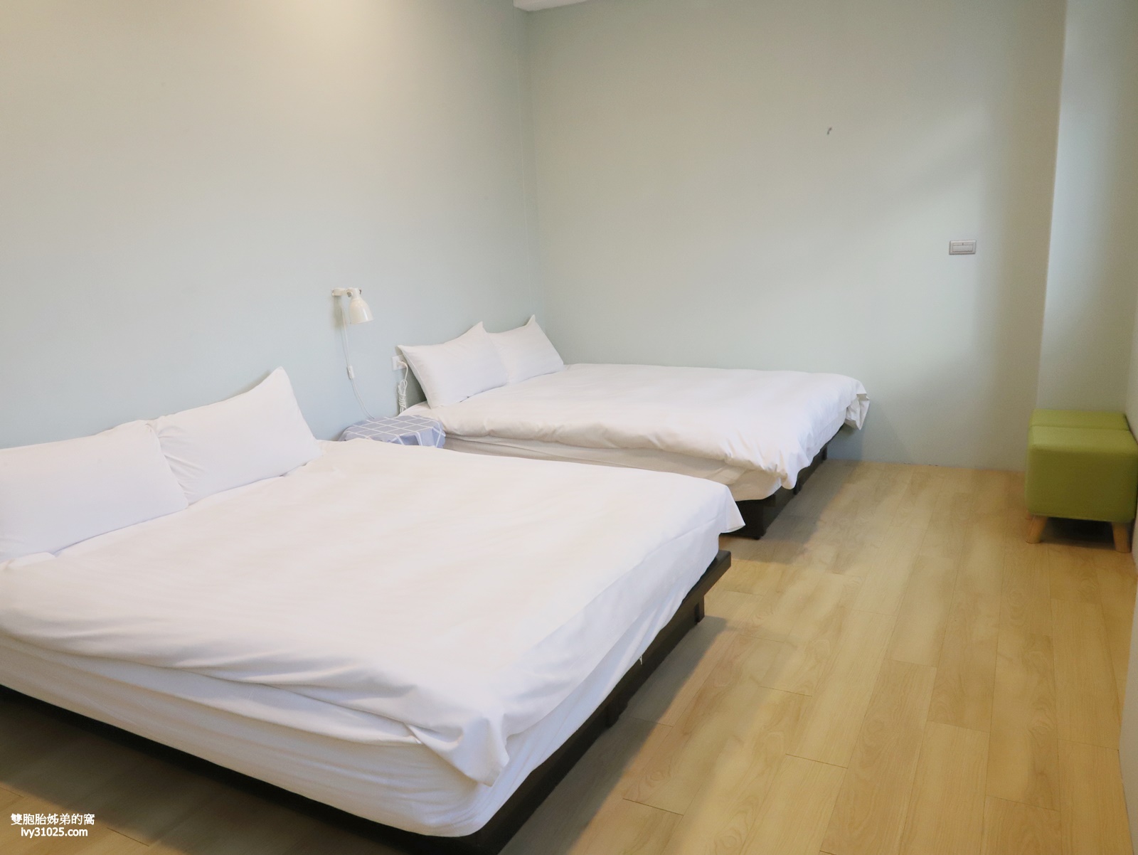 M.house旅宿的四人房採取簡約典雅的歐式風格,沒有太多華麗的裝潢,牆壁邊附有一個小壁燈以外,更在牆壁上安裝液晶電視及空調分離式冷氣。